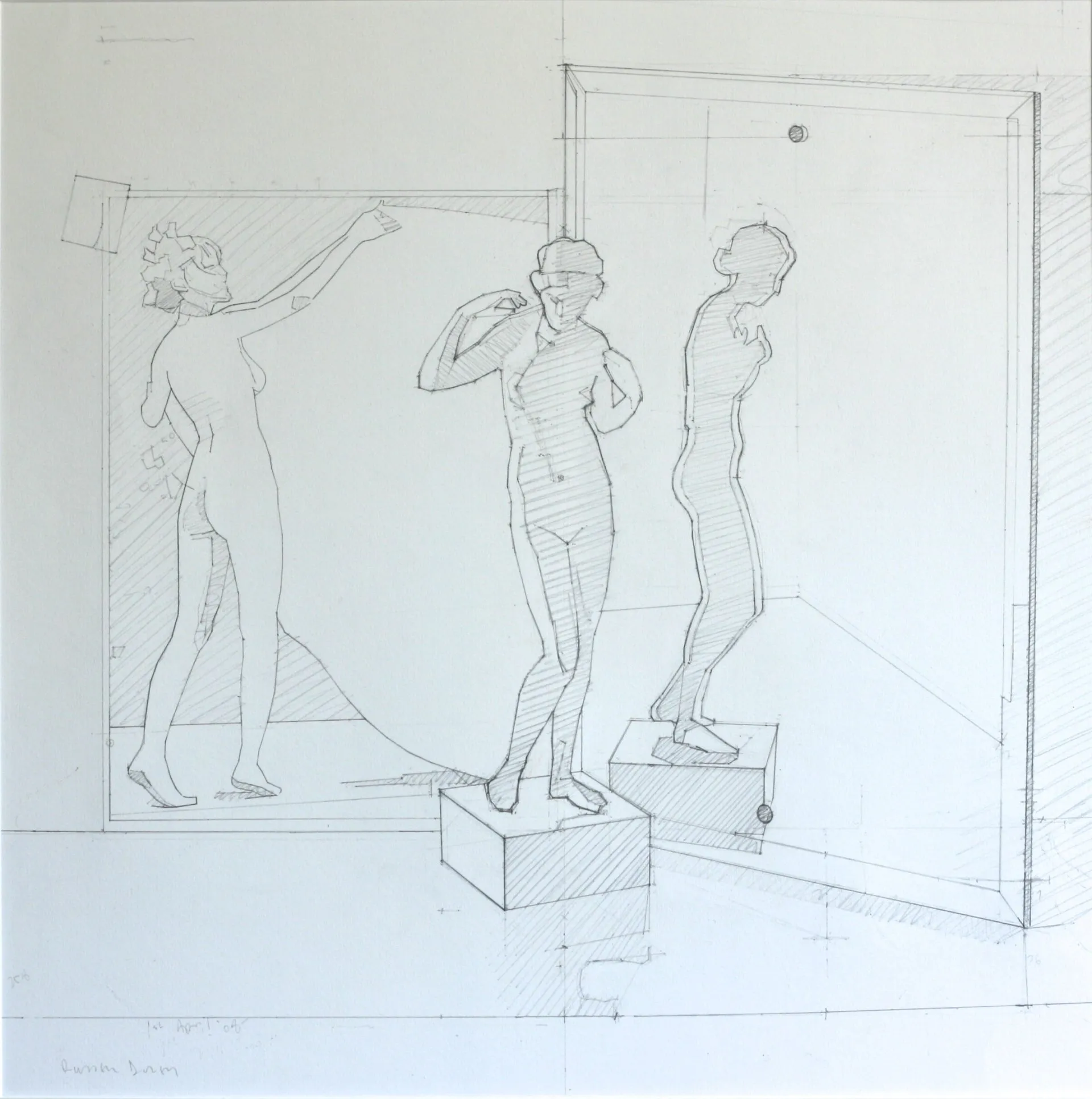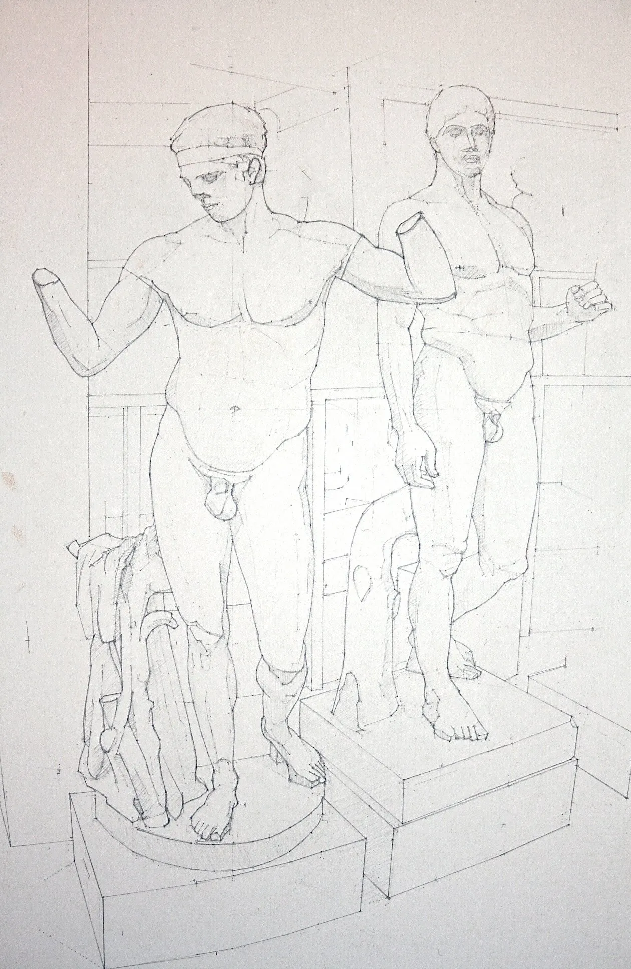 The RA School hired Life models for a week at the most. I wanted single poses and for much longer; the whole week or weeks when possible, whereas many students wanted short poses. after my initial term in the Life Room I found that, ironically, I could study the human body more intensely by working from the casts of Greek and Roman sculpture that lined the corridor in the School. My drawings became plotted, precise and clinical.