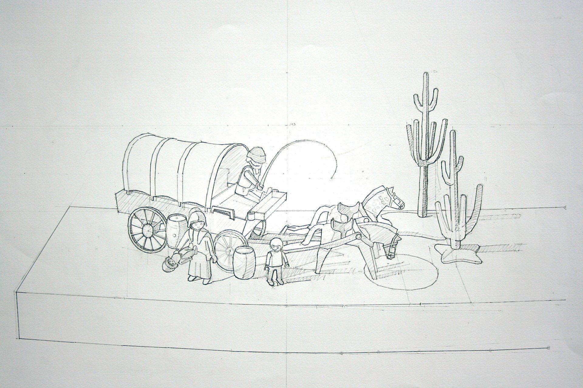 I set up little tableau, scenes of the old wild west, carefully arrange the objects and make a meticulous drawing for each painting.
