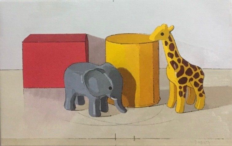 Cattle at the Waterhole was conceived as a composition within an ellipse. I’ve always admired Morandi’s elliptical compositions, both oils and etchings, so I had a carpenter make me some copies of a Victorian elliptical stretcher. My drawing included a couple of cowboys who didn’t make it into the paintings (they were too whimsical), I made a second painting, this square version. What interested me was describing the surface which the toys are standing on and modulating the colour across the surface of the sand coloured hardboard, establishing the plane and either keeping the paintwork dead flat or allowing it to be more busy.