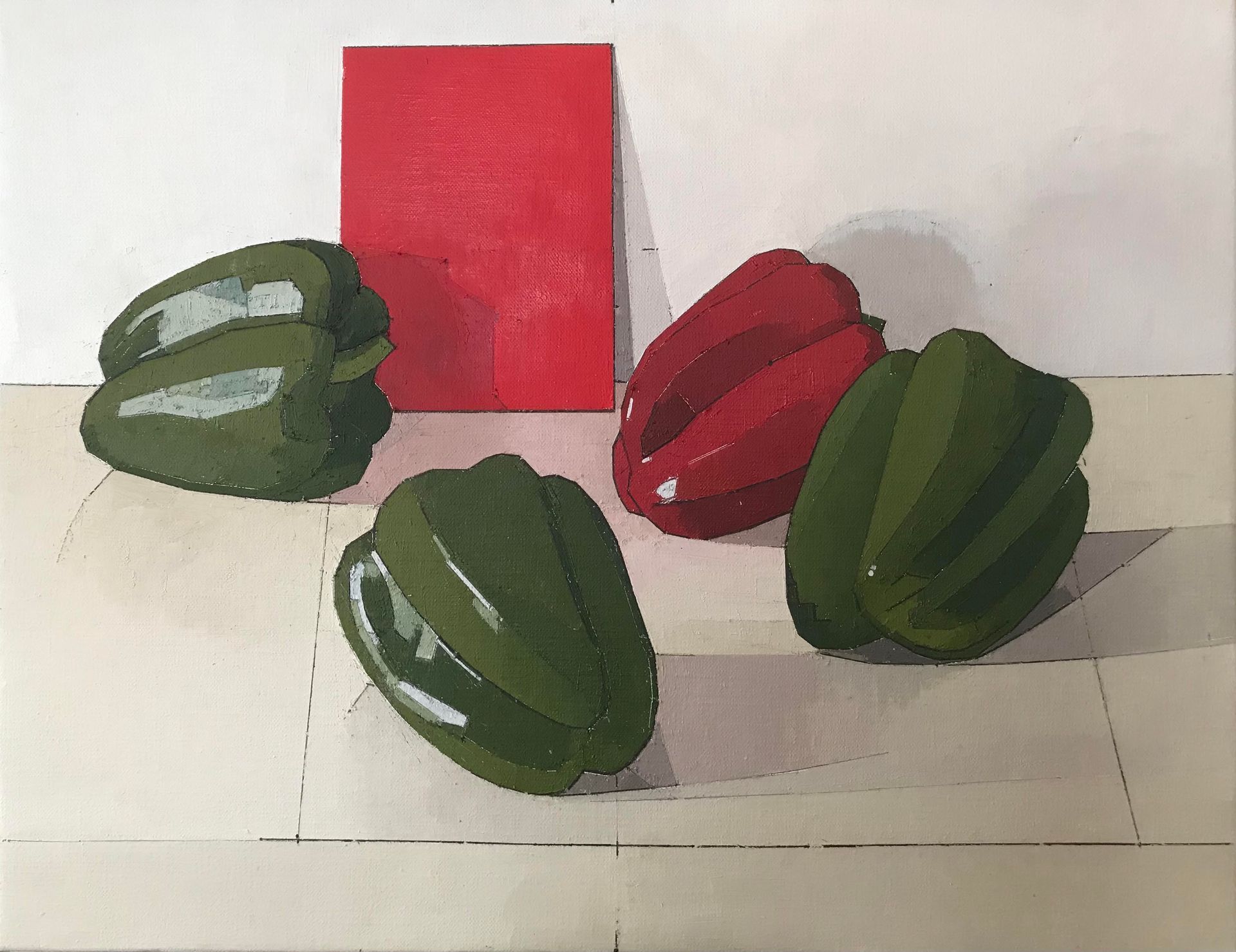 RED AND GREEN PEPPERS WITH RED CARD. *
